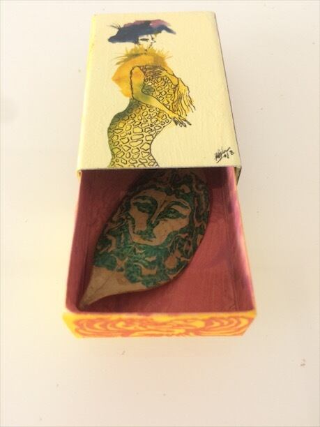 表面は水彩とペンで描画。サイドと裏面、上下面に消しゴム版画による模様を捺印。仕上げにニス。箱の中は版を押した葉っぱが入ってます。