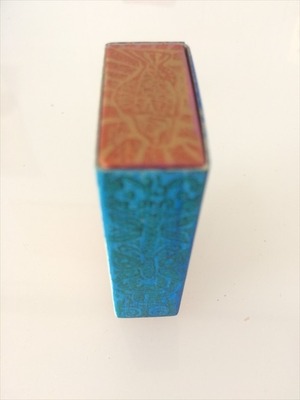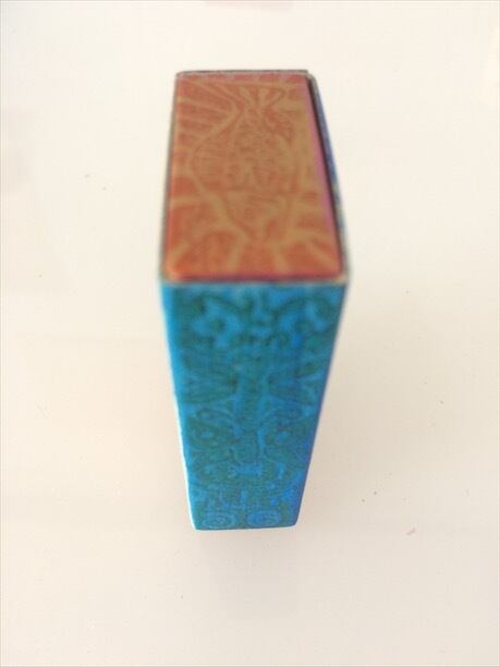 表面は水彩とペンで描画。サイドと裏面、上下面に消しゴム版画による模様を捺印。仕上げにニス。箱の中は版を押した葉っぱが入ってます。